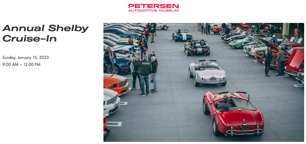 Shelby Cruise-In at the Petersen 2023 Leave a comment For more details, click here: https://www.petersen.org/events/shelby Cobra Owners Club of America, Orange CountyAverage rating: 0 reviews